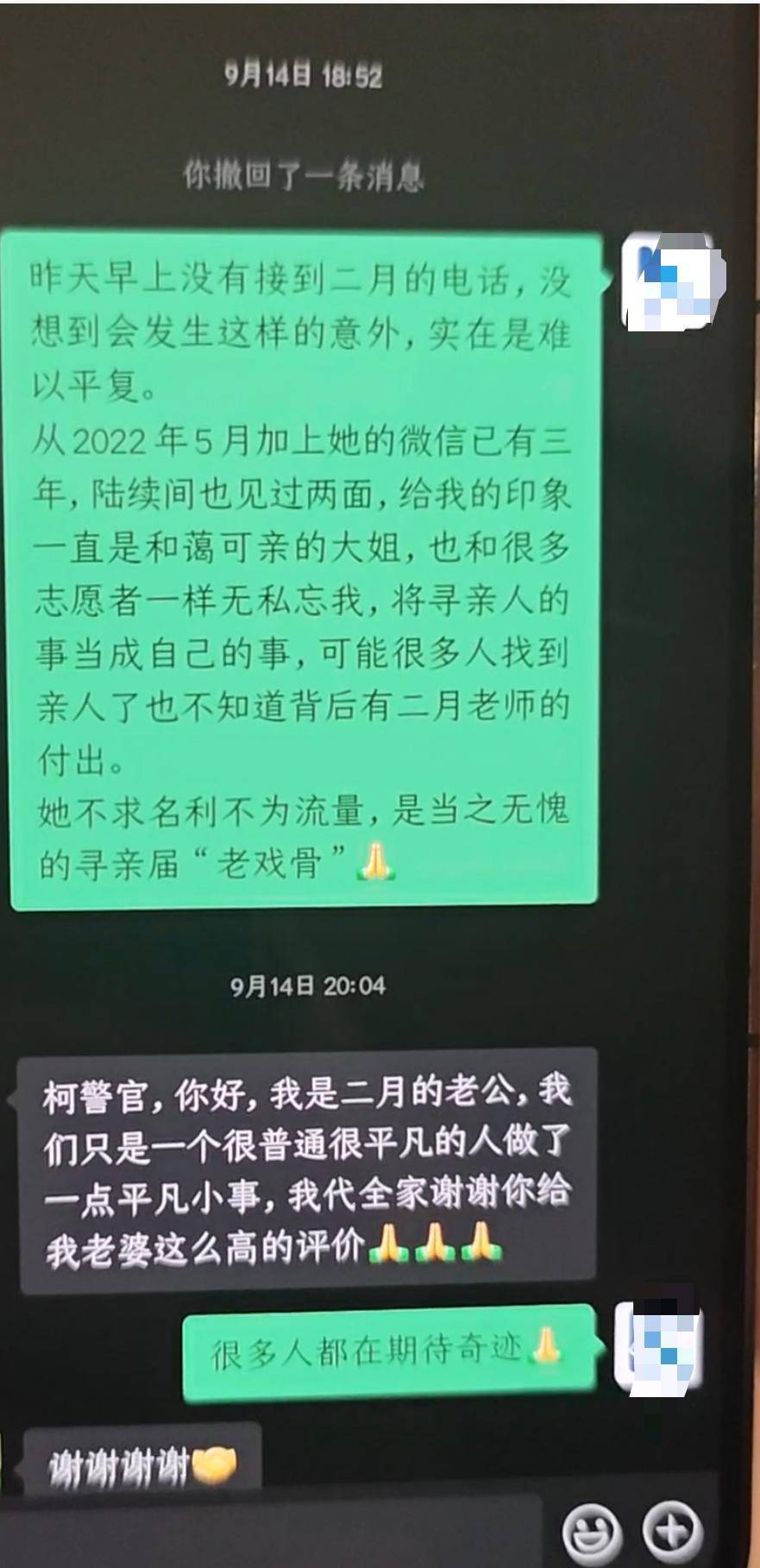 9月17日,宝贝回家志愿者协会发出讣告。讣告中写道:“二月格桑”自2011年加入宝贝回家以来,十四载春秋里,始终怀揣对寻亲事业的赤诚与热爱,全身心投入失散家庭团圆工作,用耐心对接每一位求助者,用坚持追踪每一条微弱线索。十四年间,经她直接协助或间接推动,数百个曾破碎的家庭得以重聚。