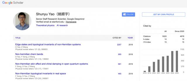 2018 年,姚顺宇在《Physical Review Letters》(国际物理学领域最顶级的学术期刊之一)发表高水平论文,首次在国际上给出了关于非厄米系统的拓扑能带理论,不仅准确预测了相关现象,他还定义了两个新的物理概念。