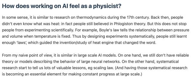 姚顺宇表示,作为一个物理出身的 AI 研究者,AI 研究目前"不懂原理但能持续找到规律"的感觉,他非常熟悉,也很享受。